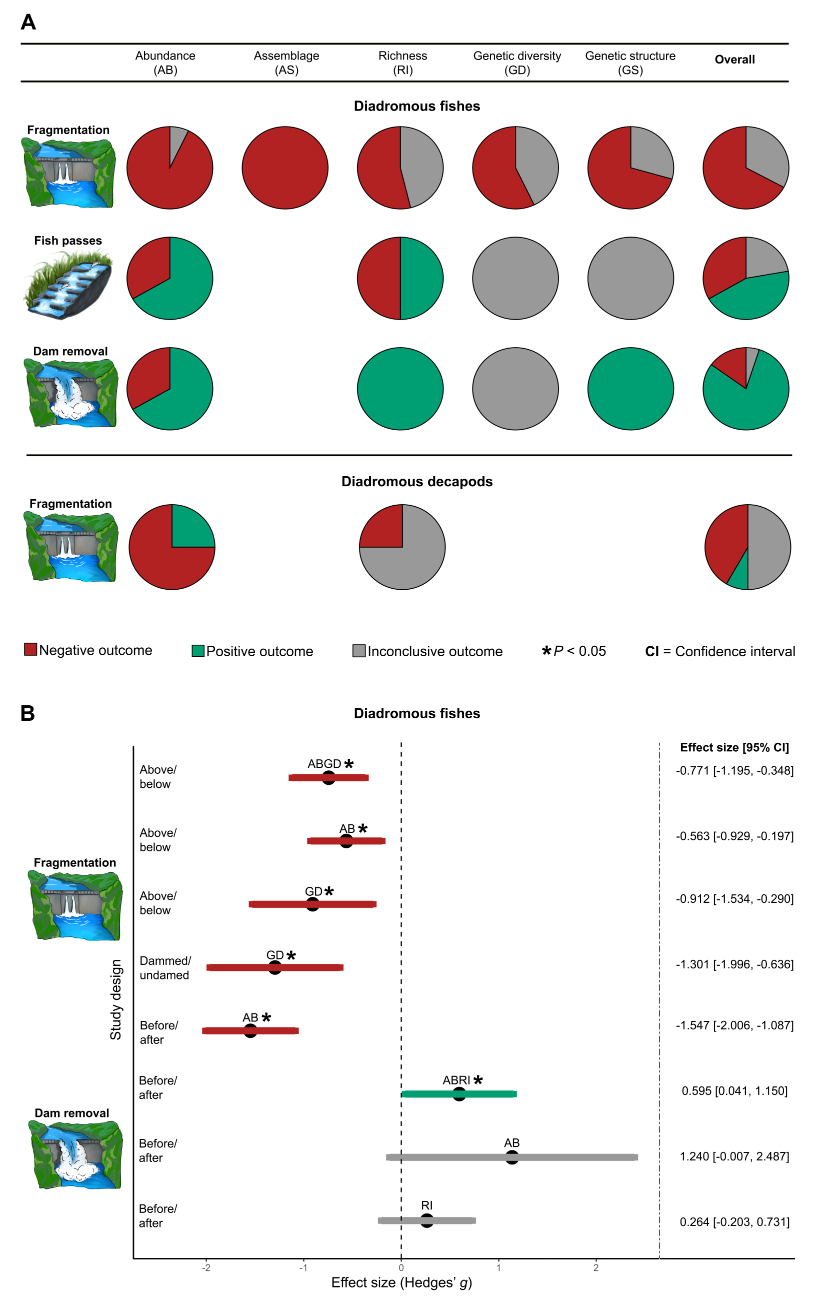 The global proliferation of dams has altered flow and sediment regimes in rivers, presenting a major threat to freshwater biodiversity. Diadromous species, such as fishes, decapod crustaceans and gastropods, are particularly susceptible to fragmentation because dams obstruct their breeding migrations between coastal waters and rivers. We conducted a systematic review and meta-analysis of 65 studies to evaluate dam impacts on diadromous fishes. Negative effects of fragmentation on abundance, species richness, assemblage composition, genetic diversity and population structure were widespread. Obligate migrants and poor climbers were more impacted, though facultative migrants and stronger climbers also experienced declines in abundance and reduced gene flow. Fish passage installations provided limited improvements in connectivity, while dam removal restored it. Dams on tropical rivers—rich in aquatic biodiversity—have received relatively little study, so global impacts on diadromous fishes may be underestimated. Where dam construction cannot be avoided, enhanced mitigation strategies, particularly improved fish passage designs, could help to reduce river-fragmentation impacts.